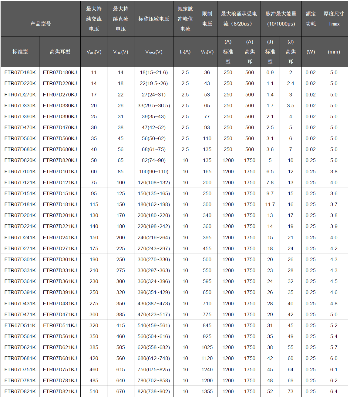 壓敏電壓: 18 - 820V浪涌承受電流: 250 - 1750A尺寸: 7mm響應(yīng)時(shí)間:<25ns