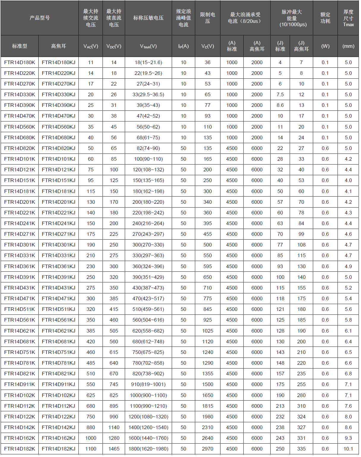 壓敏電壓: 18 - 1800V浪涌承受電流(8/20us): 1000 - 6000A尺寸: 14mm響應(yīng)時間:<25ns