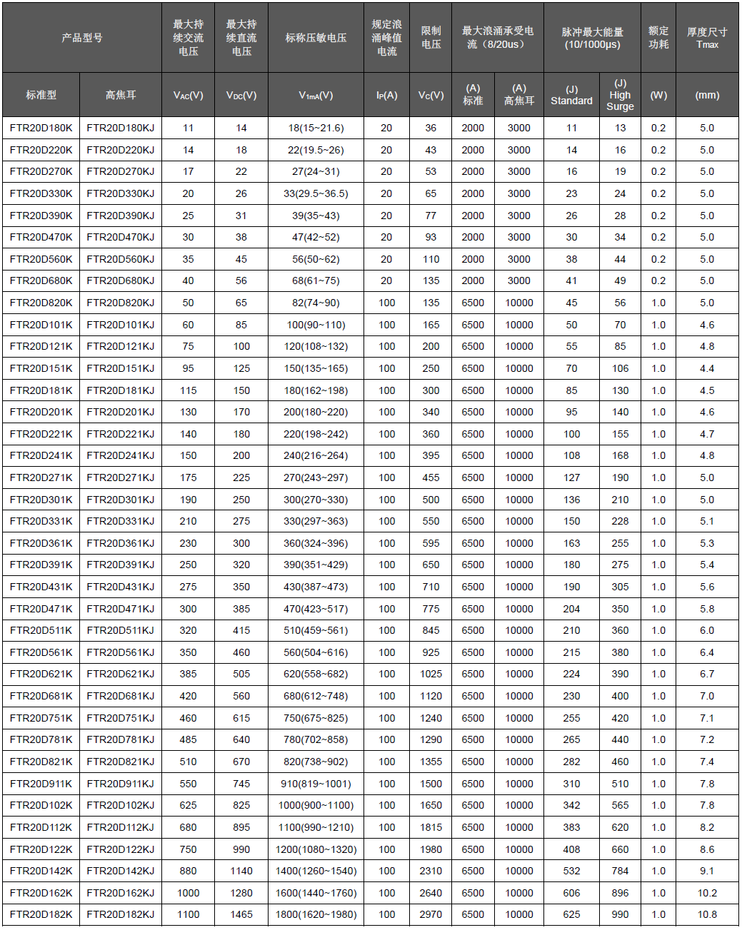 壓敏電阻: 18 - 1800V浪涌承受電流(8/20us): 2000 - 10000A尺寸: 20mm響應(yīng)時(shí)間:<25ns