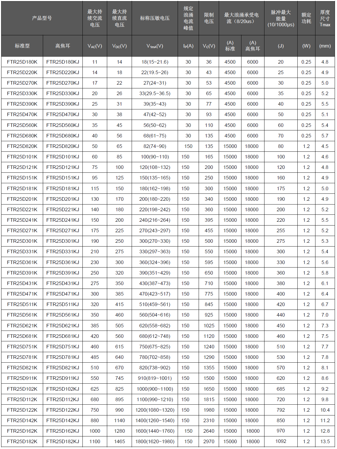 壓敏電壓: 18 - 1800V浪涌承受電流(8/20): 4.5 - 18KA尺寸: 25mm響應(yīng)時間:<25ns