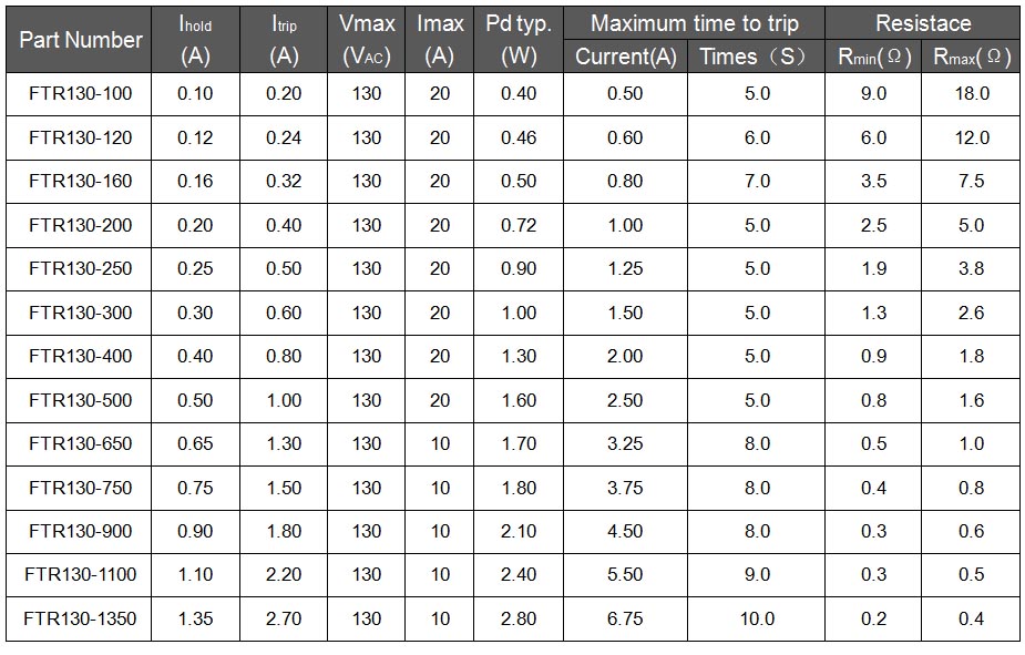 Radial leaded devicesIhold: 0.1 - 1.35AFlame retardant epoxy polymer insulating material meets UL94 V-0 requirement