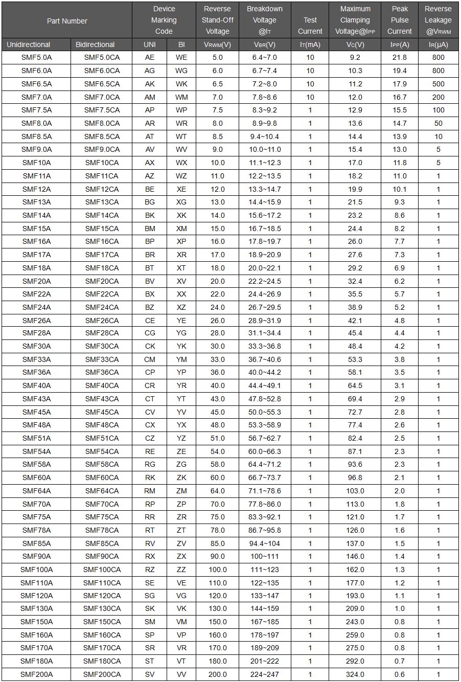Case: SOD-123FLPower: 200WReverse Stand-Off Voltage: 5.0 - 200VGlass passivated junctionExcellent clamping capabilityFast response time:typically less than 1.0ps